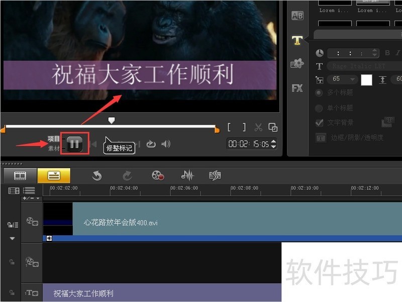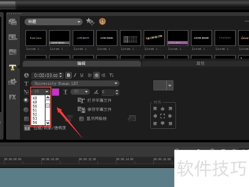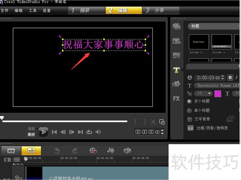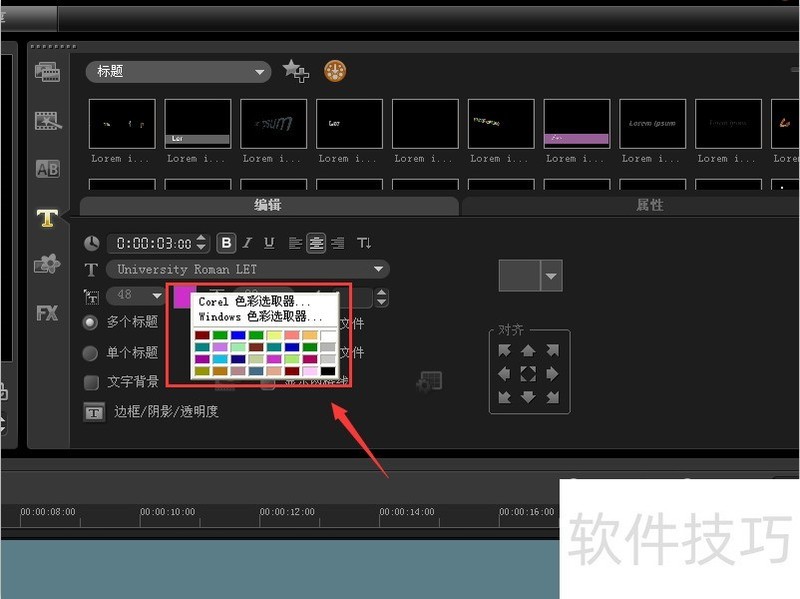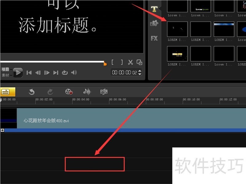 9、 也可以设置成系统自带的字体效果,上边可以看到很多的字体效果,选择你觉得需要的字体效果,直接拖到下面的文字轨当中就可以了