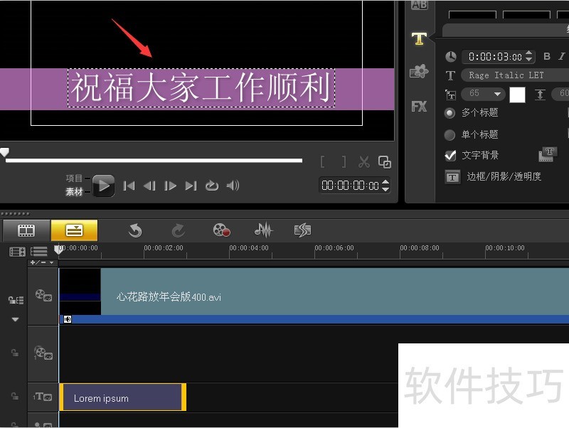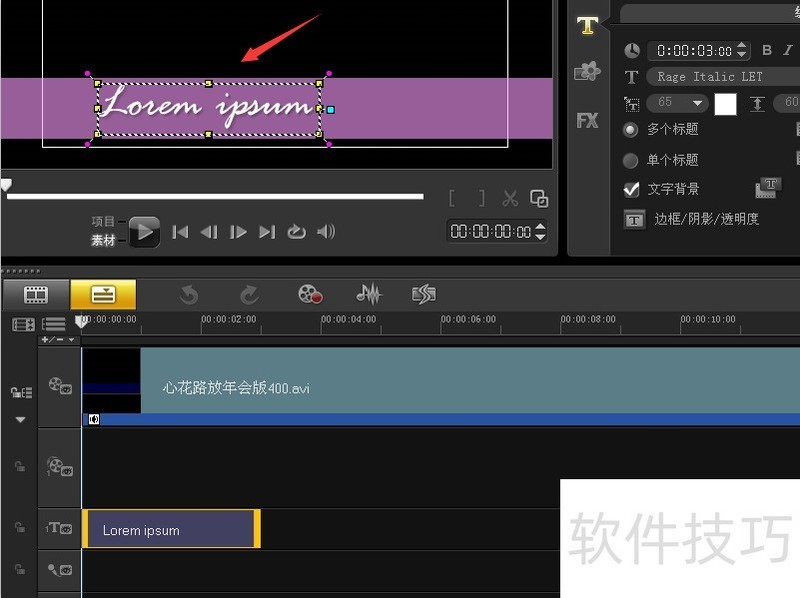 10、 拖到第三行的文字轨之后,双击一下;然后输入你需要编辑的文字(在播放窗口上输入文字的时候,也需要双击一下)