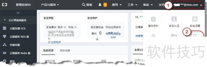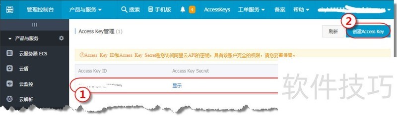 3、 Access Key Secret默认不显示,点击“显示”链接,阿里云将向您的联系人手机发送一个验证码,验证通过后,您将能看到Access Key Secret。图中1为:Access Key ID,2为:Access Key Secret;