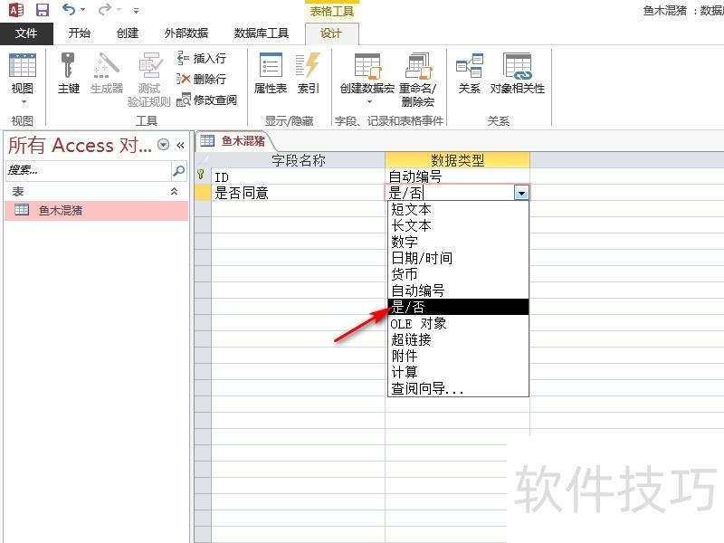 4、 在设计视图中,添加一个新的字段并命名,然后在右侧”数据类型“中选择”是/否“,如下图所示。