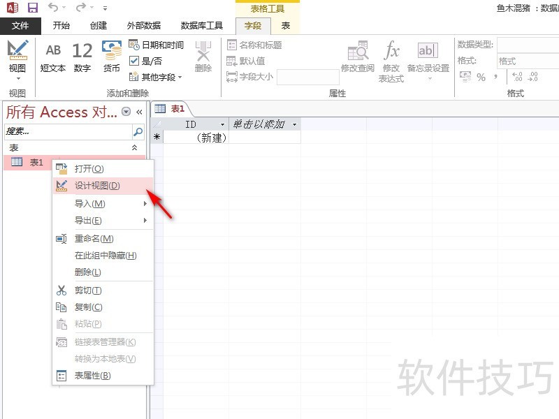 2、 右键点击左侧默认的数据表,选择弹出列表中的“设计视图“,如下图所示。