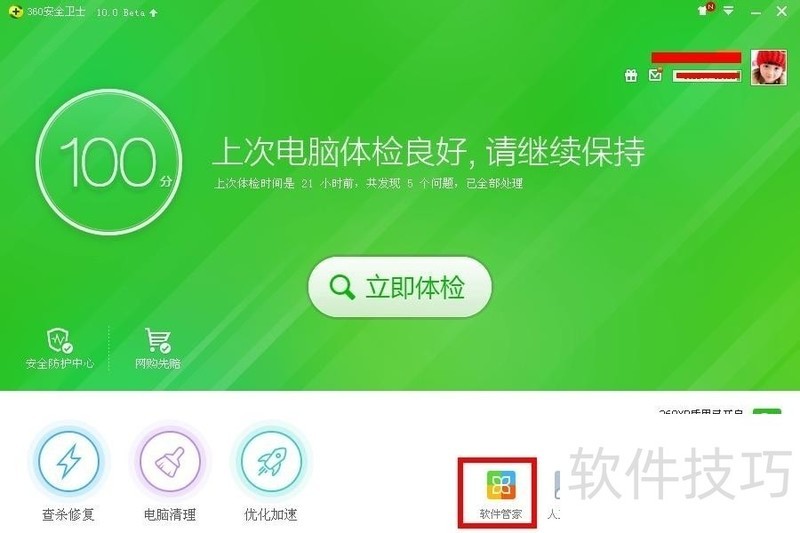 1、 首先我们打开360安全卫士,然后看到下图所示的位置是软件管家图标,直接点击进入;