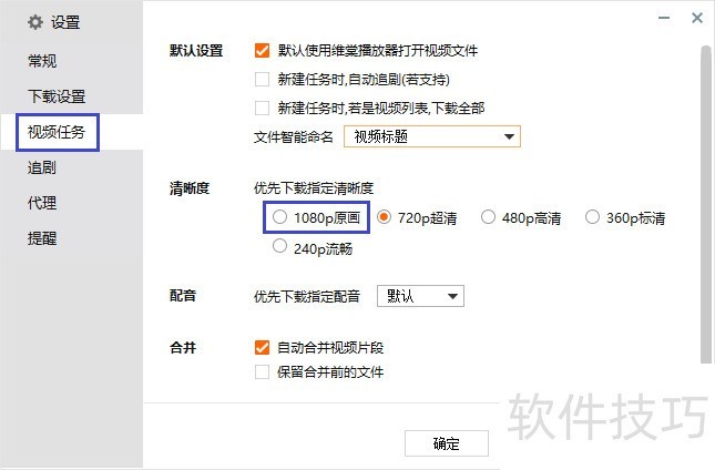3、 在“视频任务”菜单下找到“清晰度”,将清晰度更改为“1080P原画”并点击“应用”即可。