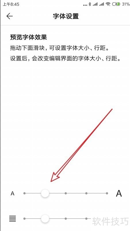5、 然后在打开的字体设置页面中,可以看到文字字号大小与段落间距调整滑块