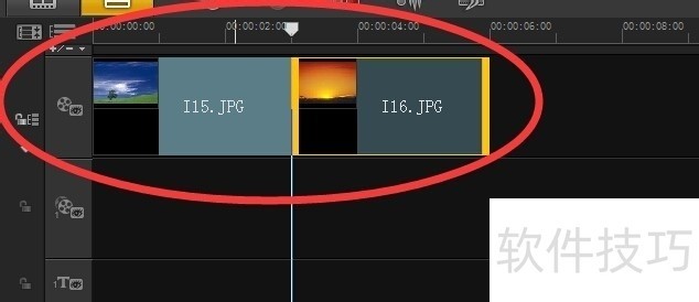 3、 然后我们选择纯色背景,选择黑色添加到两个素材之间4接下来关键的一步到了,如图所示我们分别添加两个不同的转场到纯黑色背景与两个转场交界处