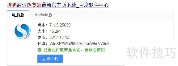 1、 在浏览器中输入“搜狗浏览器”并按下回车键来搜索,然后在搜索结果中找到它并点击“立即下载”。