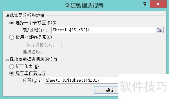 2、 选中整张数据表,插入——数据透视表,在位置中选中E1单元格。