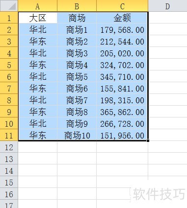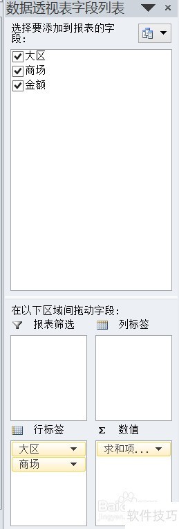 3、 在数据透视表字段列表的“大区”“商场”“金额”往下拖,得到图示的效果。