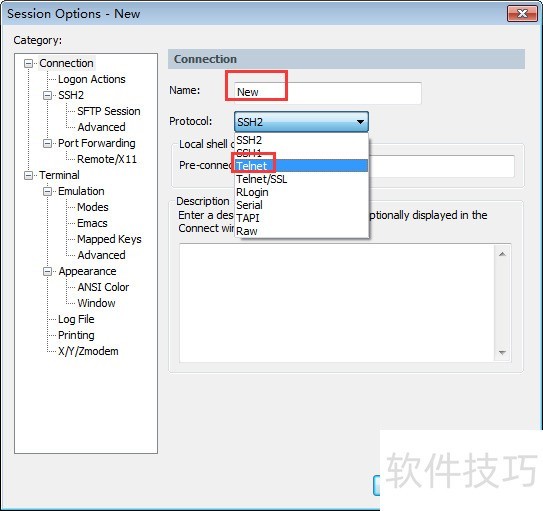 4、 修改名称,以便自动保存后,能够更加直观的看到之前连接过得信息。协议选择telnet