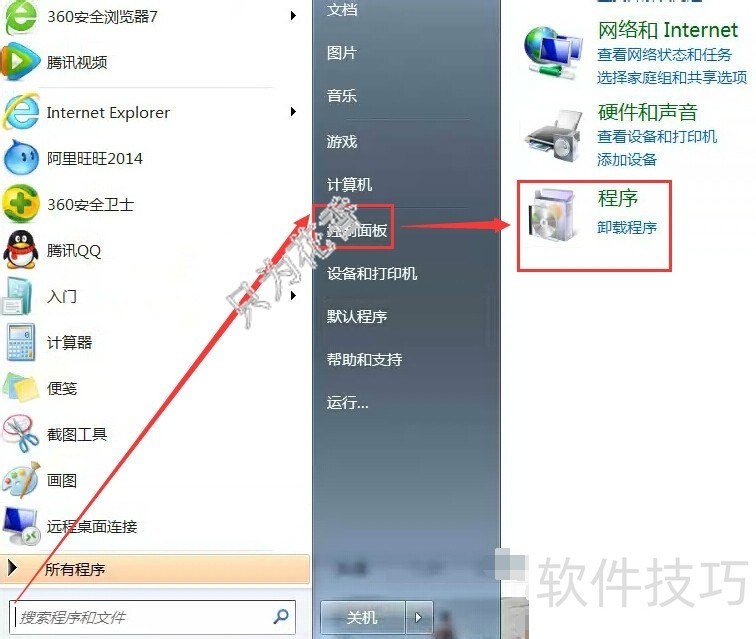 2、 点击电脑的【开始】--【控制面板】--【程序】--【卸载程序】