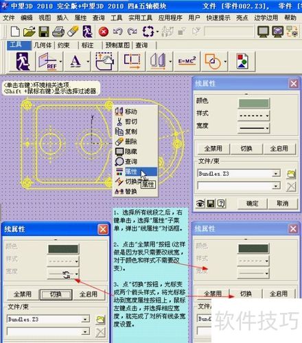 8、 细心的朋友可能注意到了,我将DWG图形导入中望3D草绘空间后,其线条宽度为细线,这里怎么线段宽度变宽了呢,其实是我省掉了改变线宽的步骤。我们需要一次性改变所有线段宽度,但线型不变,怎么做呢,看下图(图九):?