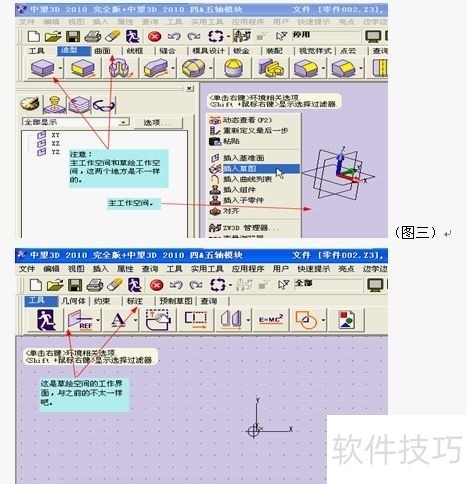 3、 点击“确定”按钮,进入中望3D主工作空间,在主工作空间,右建单击,选择“插入草图”菜单,以XY平面为基准面,进入草图绘制空间,见下两图(图三、图四):?
