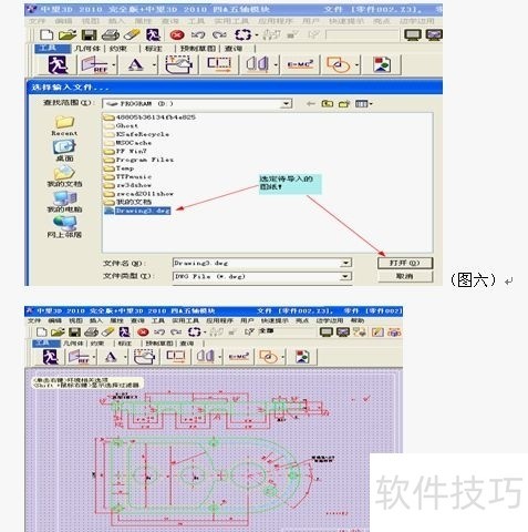5、 点击“DWG输入”对话框中的“确定”按钮,弹出“选择输入文件…”对话框,浏览找到待生成实体的DWG文件。在这里,我们选择选择Drawing2.dwg,点击确定按钮,将DWG文件导入到中望3D的草绘空间中来,见下两图(图六、图七):?