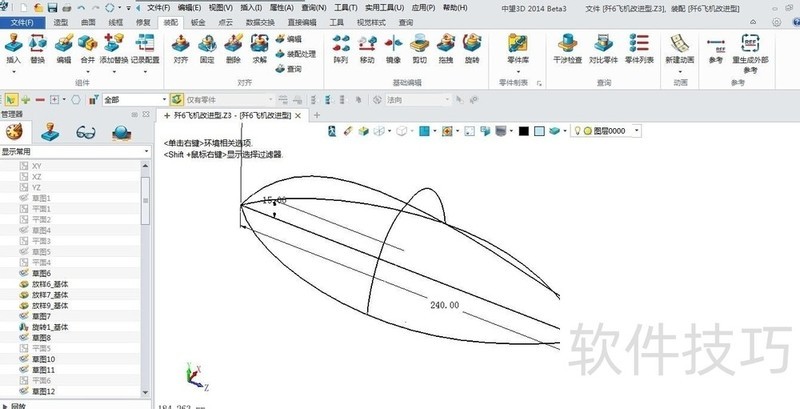 6、 通过以上两步,我们便可以发现原来在中望3D中的曲面建模是如此简单,完全可以绘制足够多的轮廓曲线来实现曲面造型的控制,从而作出你想要的曲面造型,而以上方面只是体现出了曲面建模能力,别忘了中望3D的另一大特点:快速建模。这个对于我们设计师而言,是一个高效工具,因为面对复杂的工作量,如果你用的建模软件方便快捷,将会极大地解放我们的生产力啊,那我就以机身建模为例,一起领略一下它的快速建模特点吧:?第一步,绘制机身放样所需要的草图,如下图所示:
