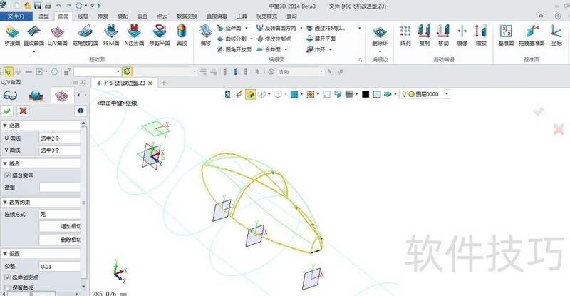 5、 绘制完成轮廓曲线后,选择曲面中的U/V曲面选项,按照同一方向为一类的原则,将曲线归为U线和V线,点击确定完成驾驶舱曲面的建模,如下图所示:
