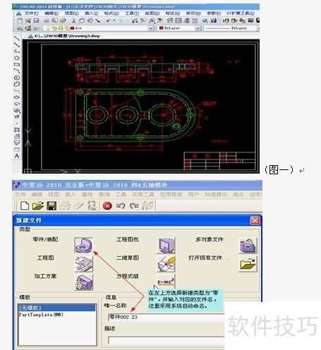 1、 下图(图一)是原来在二维CAD环境下,按比例1:1完成的设计图纸,我们在中望CAD2011中打开,浏览下图纸的内容。然后看看如何在中望3D中,以这幅图为基础,完成盖板的造型设计。?2启动中望3D2010版,新建一个空白零件文件,见图二: ?
