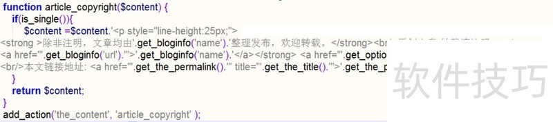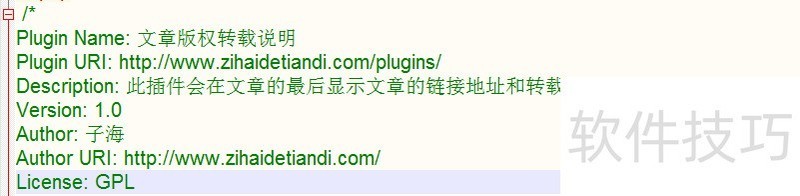 3、 编辑插件信息在article_copyright文件的开头,依次填写插件的名称、简介、插件官方地址、版本、作者、作者主页。插件名称必需按图中格式填写,否则wordpress将无法识别插件,在后台近久插件列表中不会显示该插件。其信息无可选。但是建议大家写上。