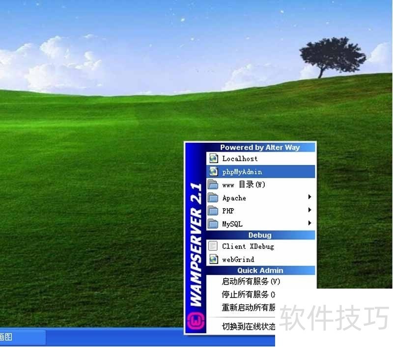 4、 网站要用到数据库,所以要先建立数据库。在软件上单击左键,选择phpMyAdmin,将打开一个本地网页(http://localhost/phpmyadmin/)用于设置数据库。
