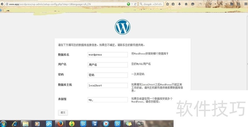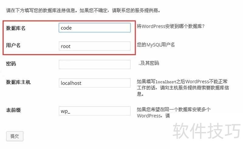 8、 数据库名即为刚创建的数据库。填写用户名,注意密码一栏先留空。其它的不要改,按默认即可。点击提交。