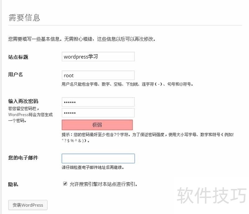 9、 下一步就是填写站点相关信息。标题、用户名,密码、邮件。在隐秘那里一般不要勾上。点击安装wordpress,一会就安装完成了。