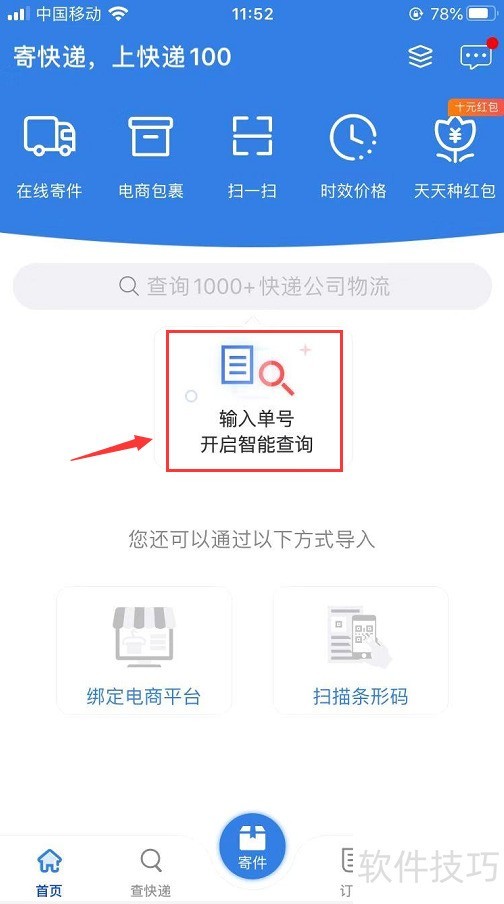 1、 打开手机快递100,在首页中间点开 输入单号开始智能查询,如下图