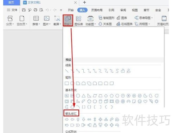 3、 点击插入选项,在其工具区里点击形状选项,可以看到箭头汇总的选项。