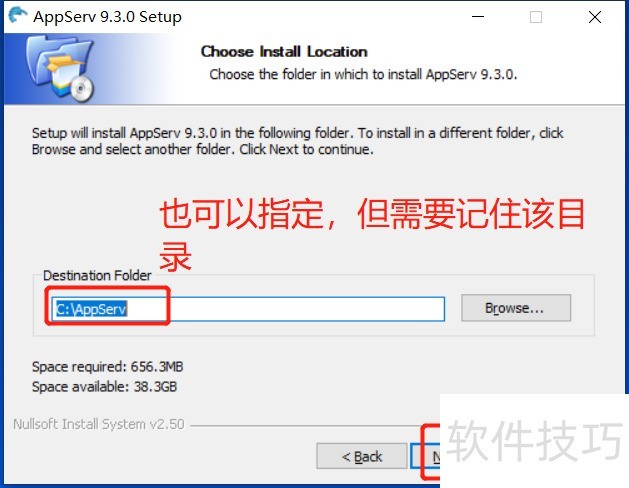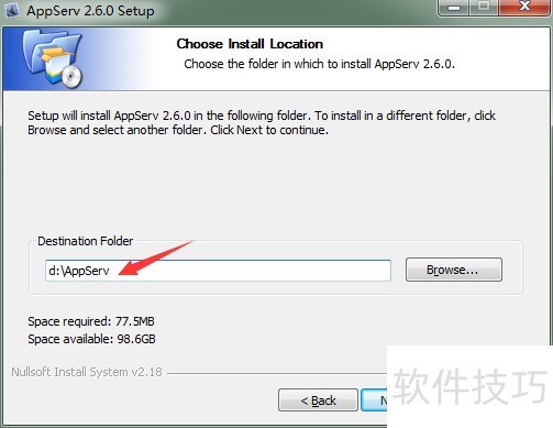 2、 下载完成以后,双击安装程序开始安装。点击“next”,继续安装,点击“I agree”,同意以上条款,然后进行下一步。3在目标路径中选择我们需要安装的位置,在这里小编将AppServ安装到了D盘。