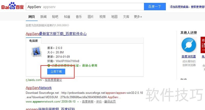 1、 首先我们下载一下AppServ环境。我们可以使用网络搜索引擎,输入关键字“AppServ”,然后点击“立即下载”。