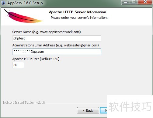 5、 在这里我们需要设置一下服务的名称,填写管理员的电子邮箱地址,以及Apache服务的端口,在这里端口默认使用的80端口。点击“next”。