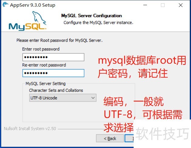 7、 这里这个比较重要,Mysql数据库的root密码。务必牢记!!!编码可自行根据需要选择,默认utf-8是没有问题的。?