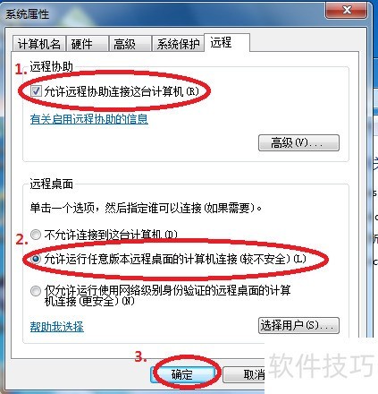 3、 在“远程”一栏中,勾选“远程协助”下的选项框“允许远程协助连接这台计算机”,并勾选“远程桌面”下的第二个选项“允许运行任意版本远程桌面的计算机连接”,最后点击“确定”。