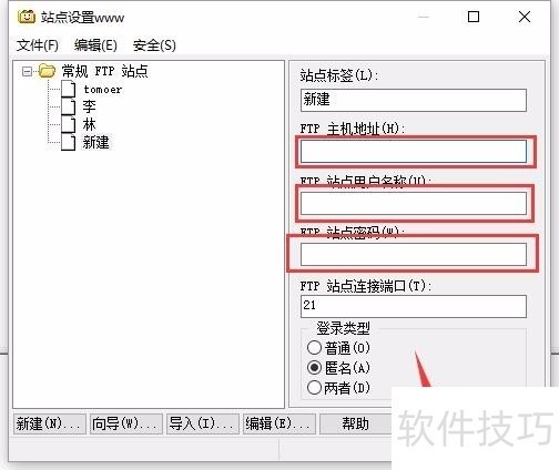 3、 定义站点: ?点击“新建”建立FTP站,然后定义站点标签,可任意填写。“FTP主机地址” 中填入您的IP地址或您的域名都可,如:218.244.137.201 ,“站点用户名”中填写您的用户名(管理员用户名),“站点密码”中填写您的密码。输入密码时,框中只有*字,防止被别人看到。FTP连接端口为默认的“21”,登录类型请选择“普通”。?