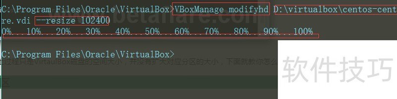 5、 然后使用VBoxManage modifyhd [虚拟机vdi文件位置]?–-resize [102400] ?进行扩容如图,VBoxManage modifyhd是命令,D:virtualxxxx是要扩容的虚拟机vdi文件路径 ?102400是以M为单位,也就是更改为100G然后运行,就扩容成功了