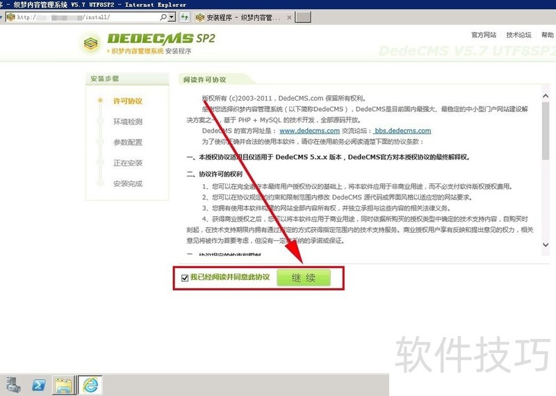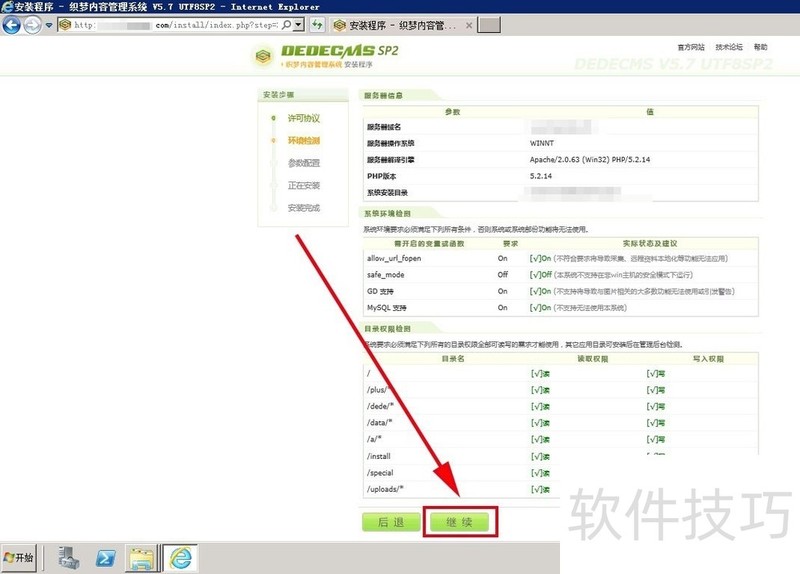 4、 首先进行环境检测,要求网站根目录文件夹具备可读写功能,检测通过才能进行安装然 ,后点击继续按钮,进行下一步。