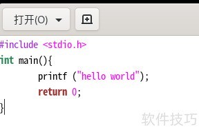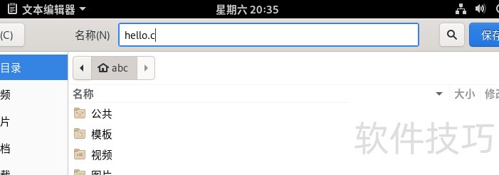 4、 打开gedit编辑器创建一个c语言编写的代码文件:hello.c。