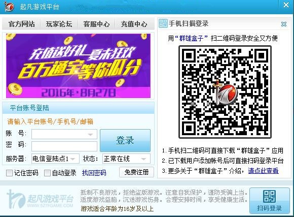 官方软件分类:对战平台大小:283.96 MB时间:2026-08-11软件介绍:起凡游戏平台是由国内老牌开发团队自主研发的专业电竞网游平台,在推崇绿色健康电竞游戏文化的同时,本着让 立即下载ibox对战平台服务端 1.0