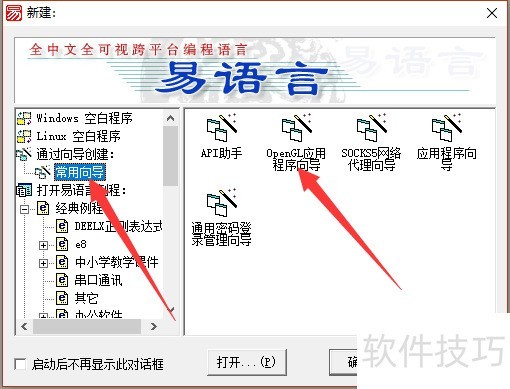 1、 打开易语言,在程序菜单点击新建2在弹出的窗口中选择"常用向导",选择"opengl"