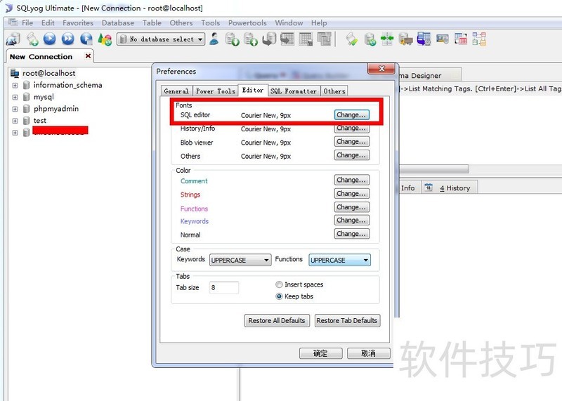 6、 然后在Fonts区域,找到SQl editor项,然后点击右边与之对应的change(修改)按钮;如下图: