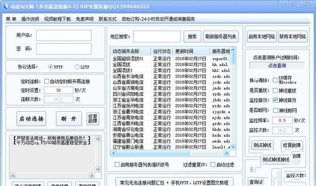 “动态IP大师”是一款功能强大的动态IP拨号软件,支持全国混拨和单独城市拨号。该软件提供了千万个动态纯净IP地址供用户选择,并且支持多种协议选择,如PPTP和L2TP。此外,该软件还具备自动断开再连接、掉线报警声、掉线自动禁用本地网络等功能。用户可以根据自己的需求进行配置和使用。该软件适用于Windows XP、Win7、Win8、Win10等操作系统,并且支持虚拟机使用。同时,该软件还提供了定制功能版本和24小时自助订购服务。“动态IP大师”是一款功能强大、易于使用且适用于多种场景的动态IP拨号软件。