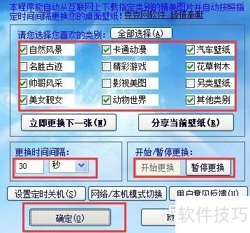 2、 第二步进入电脑桌面壁纸自动换软件主界面后,在界面有自然风景、卡通动漫、汽车壁纸等等很多类型的壁纸,可以选择喜欢的壁纸类型,选择完成后再界面下方可以设置壁纸更换的时间间隔,设置完成后就可以点击确定。