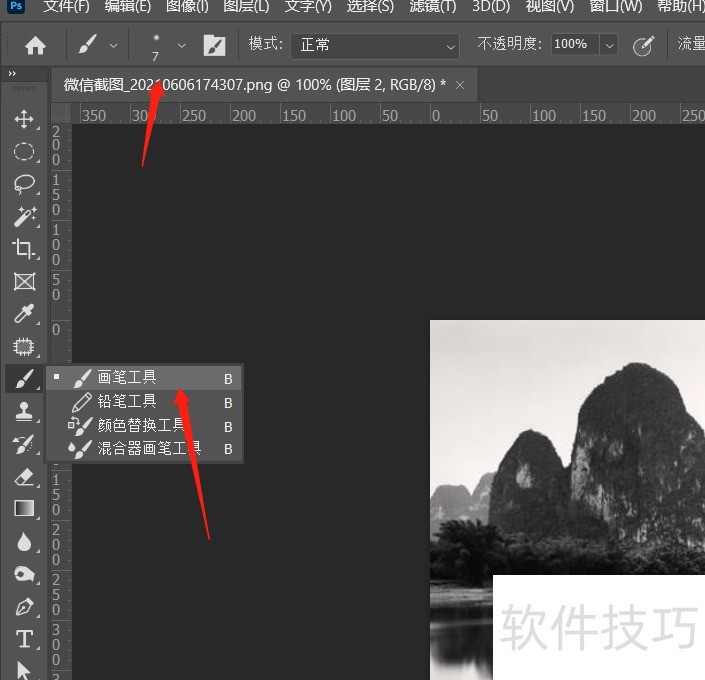 2、 ? ? ? 在左侧图标选择“画笔工具”如图,并在上方工具选项栏中选择“柔边画笔”。