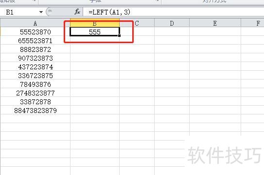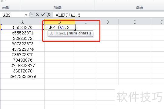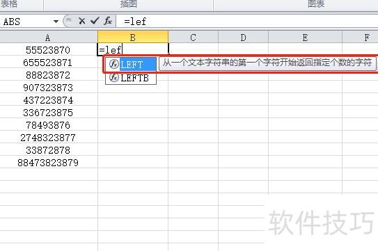 在B2单元格输入LEFT函数,用于从文本左侧起提取指定数量的字符。