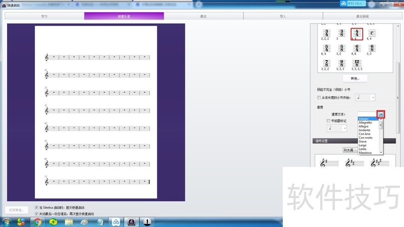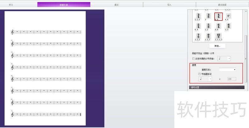 1、 打开软件:快速启动-新建乐谱,选择适合的一种谱,此处以“高音谱表”为例。关注图片中的红色框内,速度记号可以用速度文本表示,也可以使用节拍器标记,当然两者可兼用。