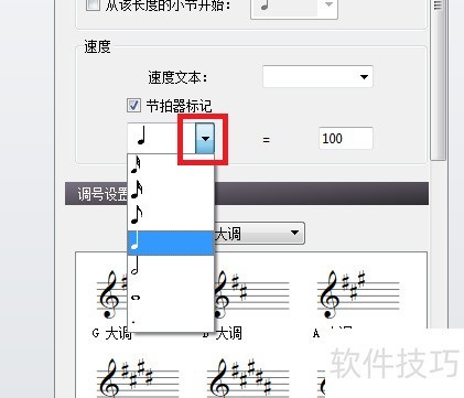 2、 勾选“节拍器标记”后,点击音符旁的向下箭头,可以在下拉菜单中进行选择。右侧的数字亦可更改。