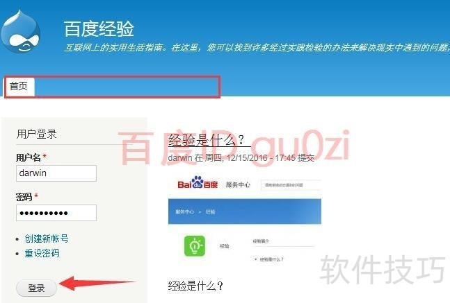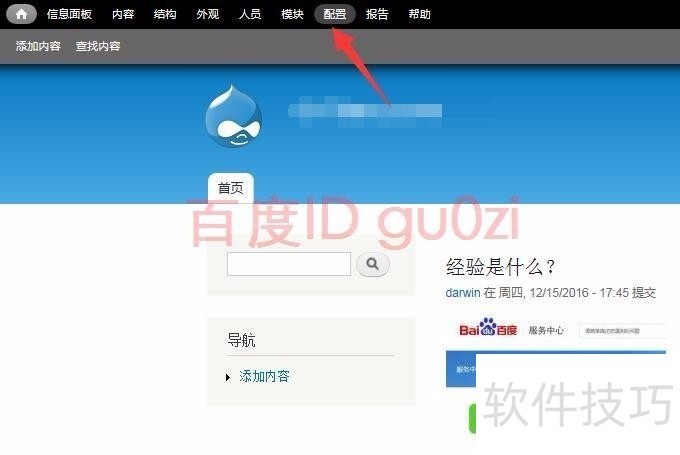 1、 这里是一个Drupal站点搭建后的简单示例,可以看到只有首页,没有其他的导航项目,使用管理员账户进行登录,