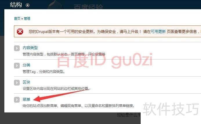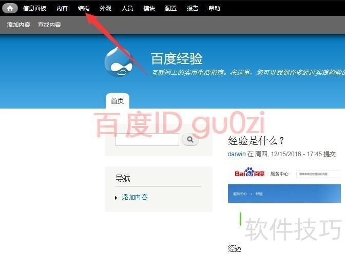 2、 在Drupal站点登录后,从上方进入结构界面,