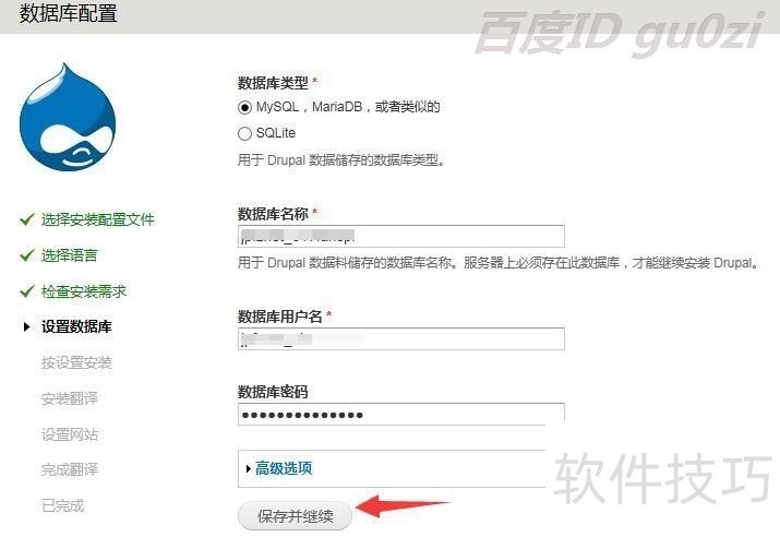 5、 这样界面,就转换成中文版的了,默认使用Mysql,输入网络空间提供的 数据库名称/数据库用户名/密码, 然后 保存并继续,