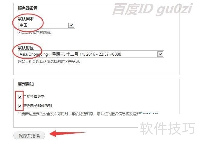 8、 最后是服务器设置,设置好默认国家/默认时区,更新通知选项可根据需要进行选择,然后 保存并继续,