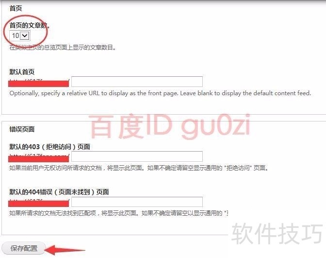 5、 在这里还可以设置首页文章的数量,默认首页页面,及出错时的显示内容,