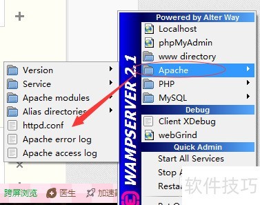 1、 找到httpd.conf 文件,快捷方式:运行wampserver,等图标变成绿色的,然后点击图标,找到apache,然后找到httpd.conf,打开httpd.conf.